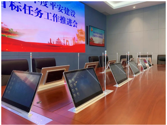 在12人的会议圆桌这里,安装了12套WZH-L2LM 15.6"嵌入升降式无纸化终端,带有电子桌牌和升降鹅颈发言话筒。它们具有铭牌显示、文件批注、同屏广播、分组广播、异步浏览、跟踪主讲、外接信号显示、临时文件、主席控制等多种强大的功能;支持一键切换到Windows桌面,将Windows或其他软件的操作界面同屏显示到其它无纸化终端和大屏幕。