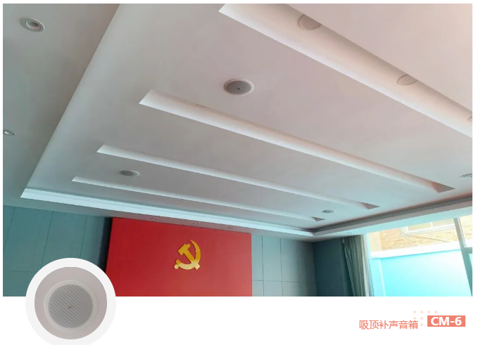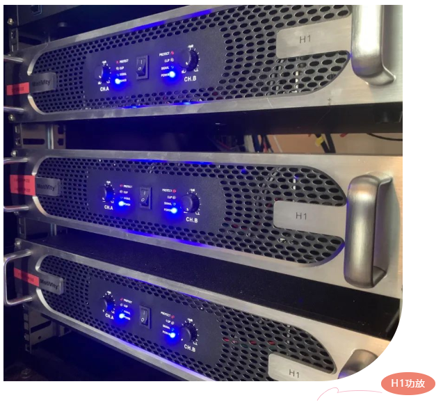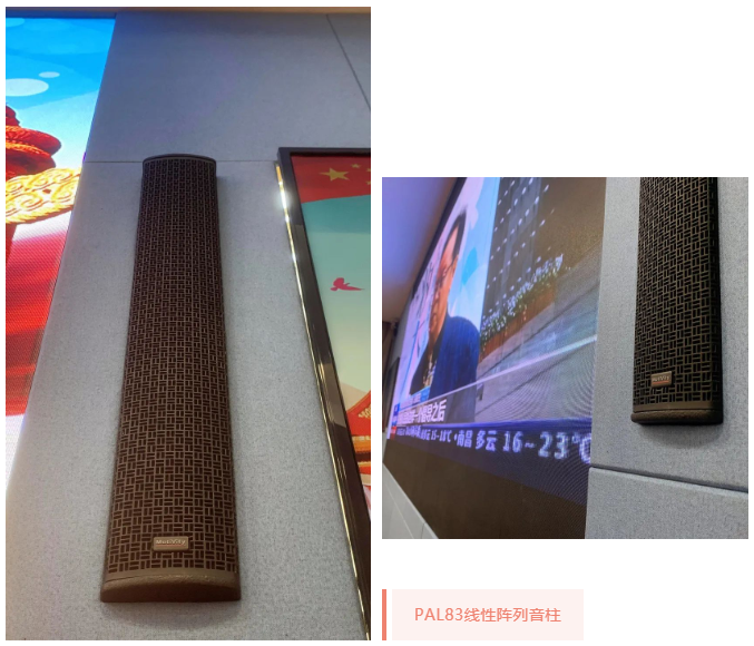 使用了两只PAL83线性阵列音柱作为主扩音箱,嵌入式安装于大屏幕两边,天花安装了6只CM-6吸顶补声音箱(分两只一组,共3组),搭配3台H1功放进行扬声器功率放大。整体上既保证了现场扩声均匀度,又能与环境融为一体,视觉上显得