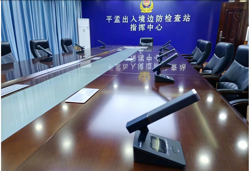 广西平孟出入境边防检查站指挥中心采用HUAIN华音无线双振膜会议系统(HY-U5880系列)搭配可视化管理系统、中央控制系统、扩声系统等会议系统来推动智慧检查站建设。HY-U5880系列适用于各类高要求会议场合,拾音距离可达60cm,拾音细节精准控制,最大程度上减轻声音在传输过程中的音质损耗。