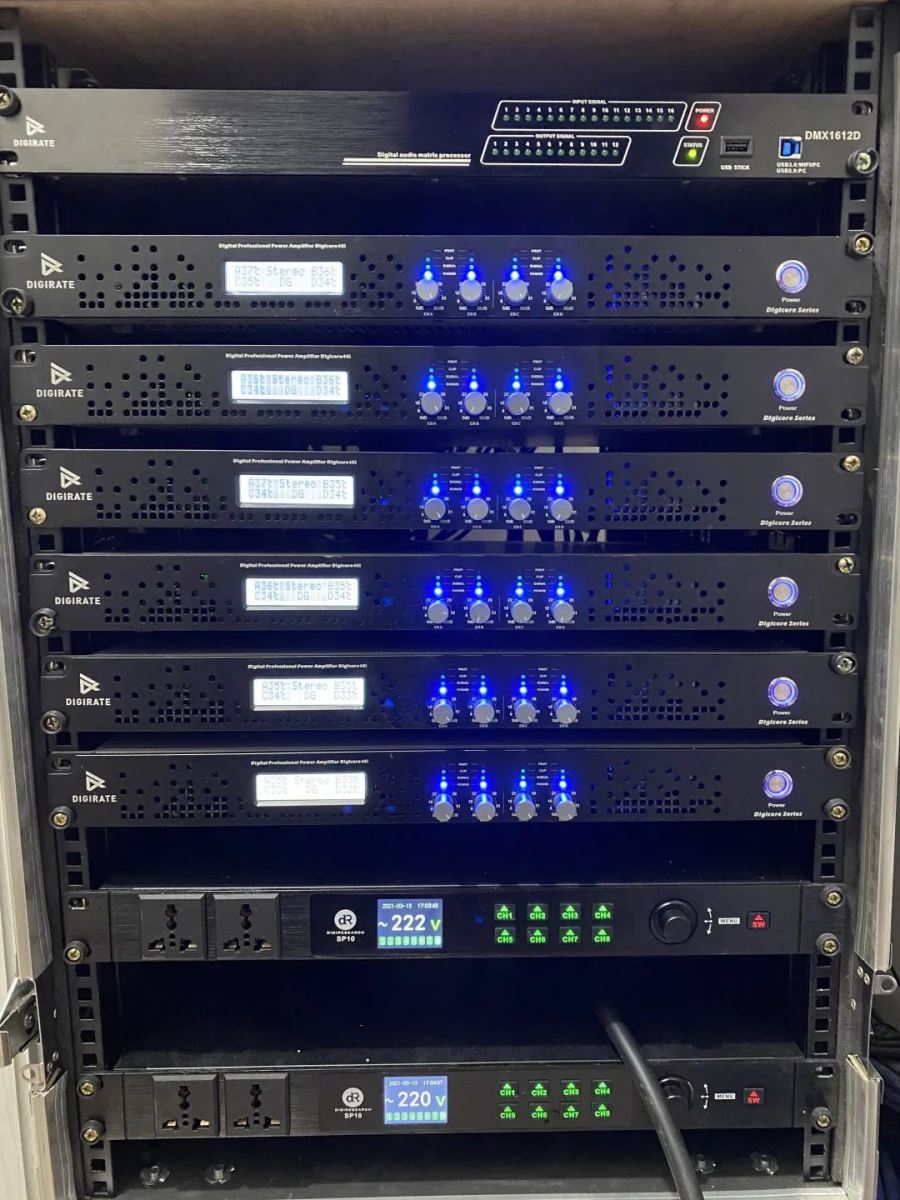 音频处理系统采用了DIGIRATE(迪吉瑞)数字音频处理器:DMX1612D系列、数字功放DIGICORE系列以及大量乐器话筒。