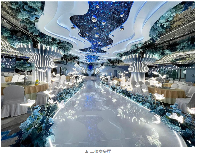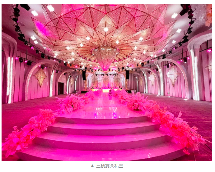 艺术宴会中心三楼宴会礼堂面积900㎡,层高6m且宽阔无柱式建筑设计,可容纳500人,奢华的施华洛世奇水晶装饰,犹如缀着无数颗宝石般的星辰,向宾客诉说着一种莫忘初衷,美好永存的美妙寓意。