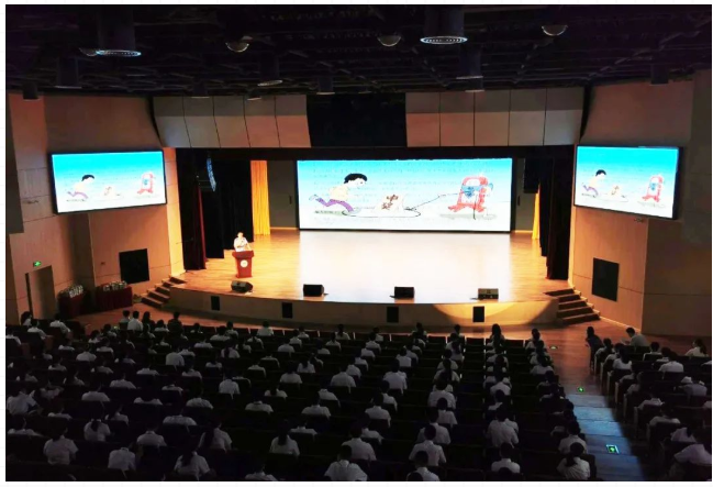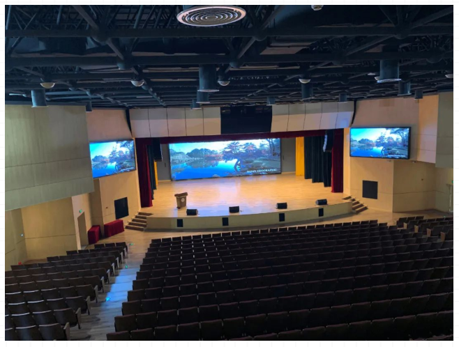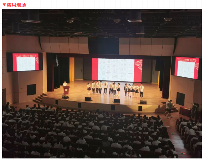 校区大礼堂是学校举行会议、学术报告、培训活动以及庆典演出等的综合用途厅堂。为满足使用要求,在礼堂配置了包括如下系统:扩声系统、灯光系统、视频系统、录直播系统以及会议中控系统等。项目自投入使用以来,承接了多场活动,包括:家长会、高考动员大会、教师节演出等。