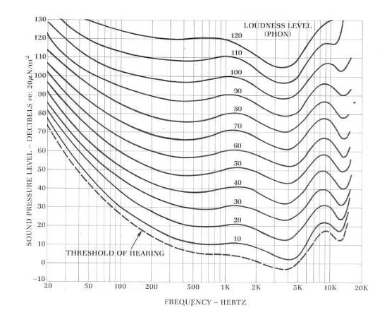 在进行声压级计算前,必须选择一个相应环境下合适的基准声压级,而基准声压级的选择必须了解正常人耳的等响曲线,即“Fletcher-Munson curves(弗莱彻芒森曲线)”。
