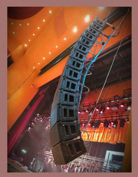 主扩系统采用左中右三组线阵列扬声器结合覆盖的方式,其中左右声道每组吊挂14只