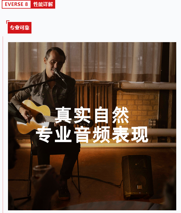 EVERSE 8 的最大声压级额定值为121 dB,覆盖范围达到100º x 100º。其核心组件包括一个使用EV专利SST(信号同步换能器)设计安装的8英寸低音单元,以及一个安装在定制恒指向波导上的高输出钛高音单元。EVERSE 8由EV兄弟品牌Dynacord的世界级音频电子工程团队合作开发的高效能D类放大器和DSP模块驱动,其专业功能包括内置具有录音棚品质的4通道数字调音台、48V幻象电源、反馈抑制和音频闪避。EVERSE 8的系统可靠性,已通过大量严苛实验和耐久性测试得到验证。