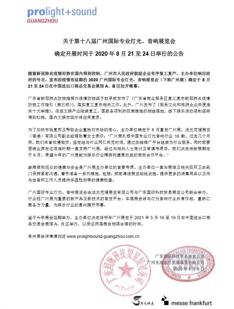 广州国际专业灯光、音响 会由法兰克福展览有限公司与广东国际科技贸易展览公司联合举办。行业视广州展为重要的新产品及新手机看片福利免费的首发平台。本届展会将与灯光音响行业并肩作战,重新汇聚各方力量,为娱乐行业的复兴揭开序幕。