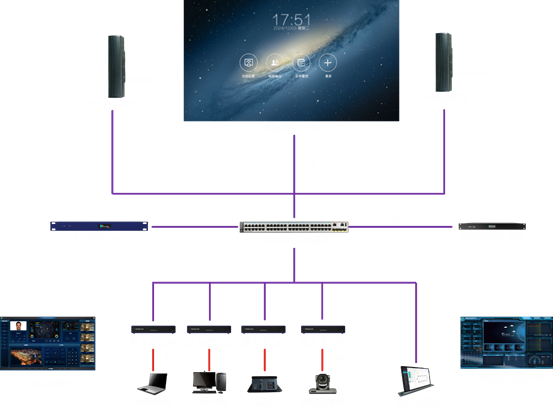 分布式音视频系统能实现PC软接入,授权安装软件在电脑上以后,电脑信号即可作为信息输入进入交换网络,供其他设备分配或者调用。并可在人机控制界面上控制电脑上的播放软件,如暴风影音等; 在授权电脑或者安卓设备或者ioses设备安装软件后,即可从电脑或者其他平台软件观看到所有接入本交换网络的所有输入信号,非常容易的实现了高清分割的功能,人机友好得到极大的提高,大大提高了对大型会议调度人员的配合程度。
