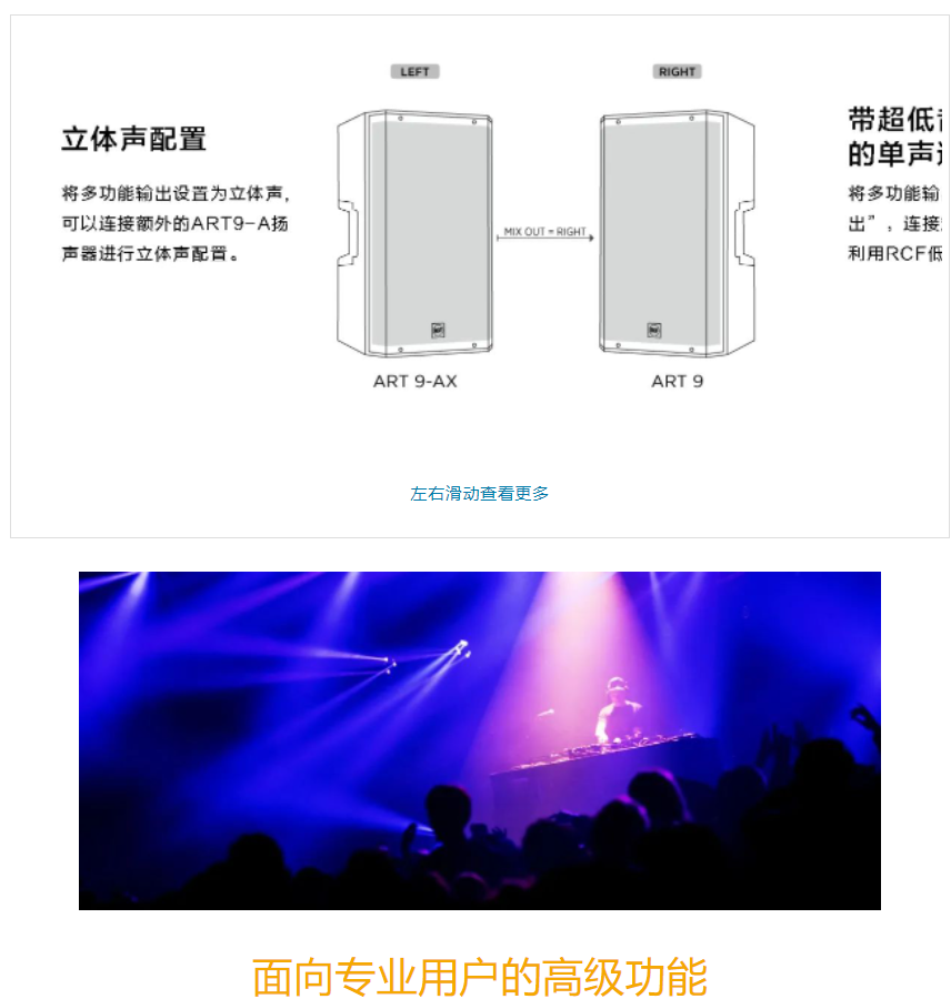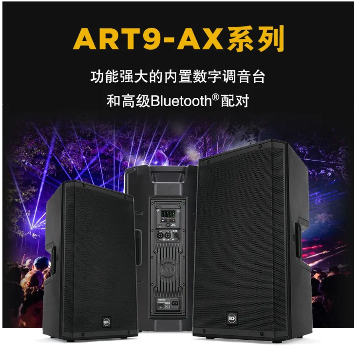 RCF最新推出了全新的ART9-AX系列,ART9-AX是一款具有48V麦克风前置放大器和线路输入、内置6通道数字调音台和高级DSP、Bluetooth®(蓝牙)流媒体和控制功能的两分频扬声器。适用于任何音频应用的顶级解决方案。