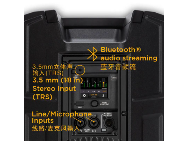 内置调音台最多可以连接两个线源或麦克风,带有单独的48V幻像电源和一个非平衡的立体声源。它还可以管理来自Bluetooth®音频流的无线立体声信号。