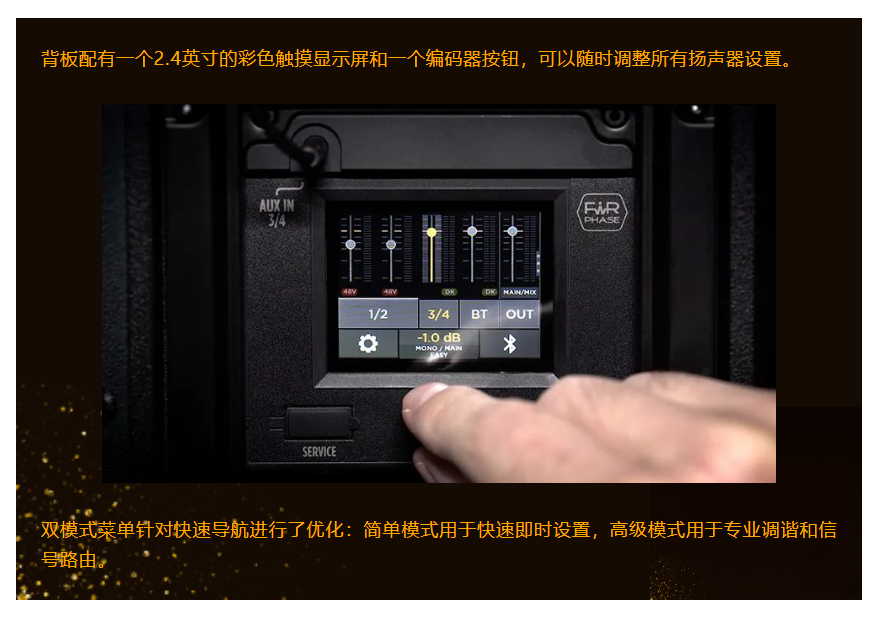 通过蓝牙和基于触摸的彩色显示屏进行远程音频和控制,可全面管理以下内部功能: