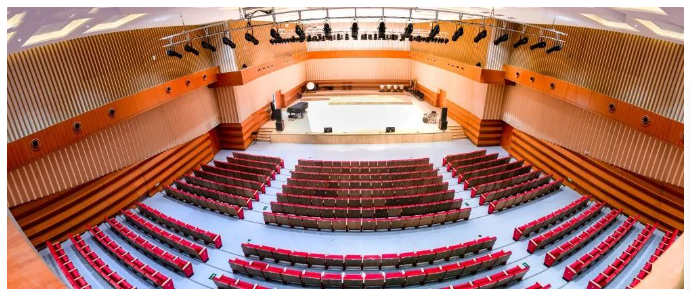 “琴岛”音乐厅建筑面积2100平方米,内部结构呈扇形状,扇形音乐厅的天顶呈等势的递进,目的是令声学能量均匀扩散。在这种音乐厅中,声乐的直接信号更容易送达。